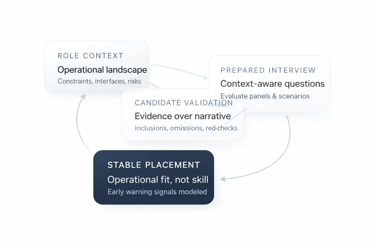 We place talent based on how organizations actually function. Constraints, risk, and accountability.